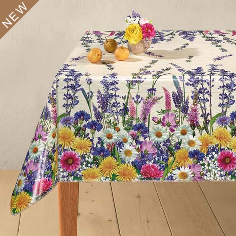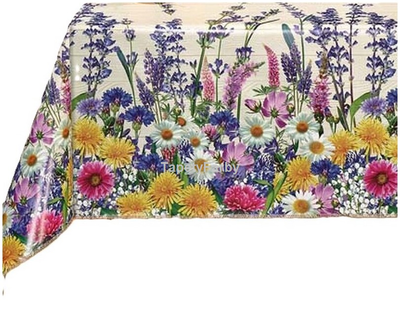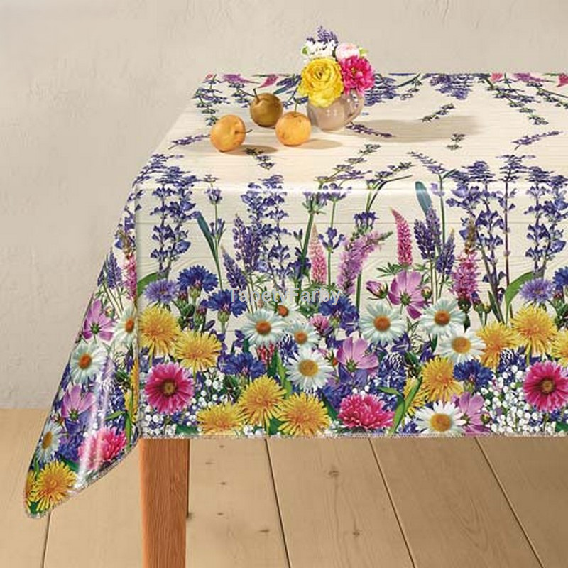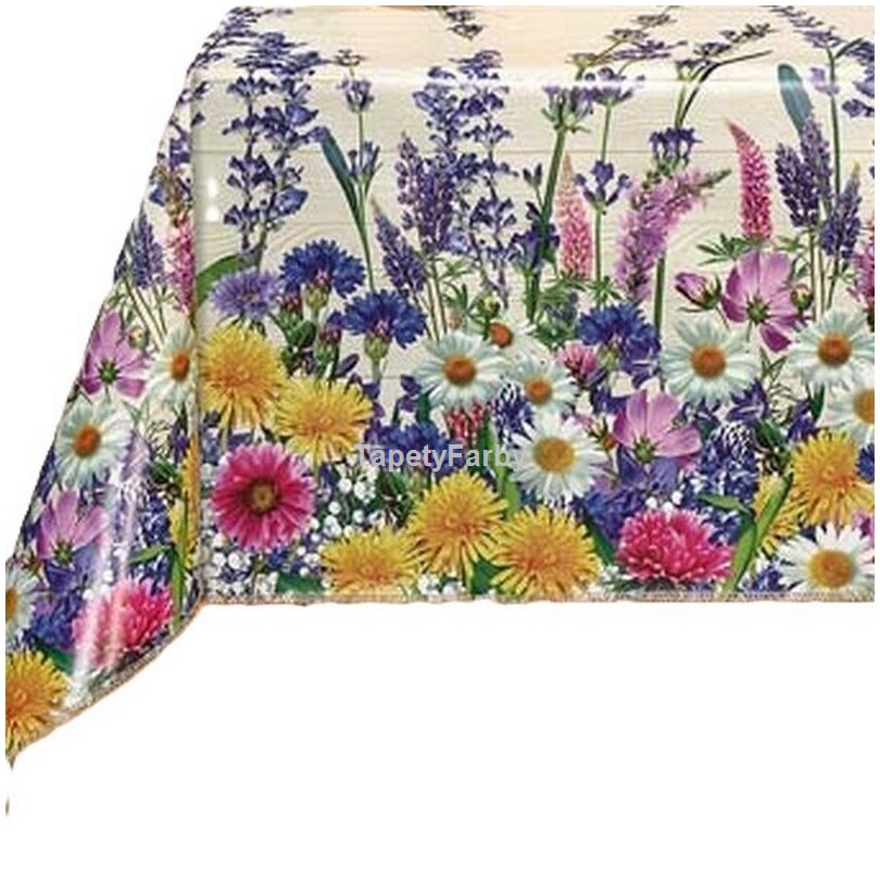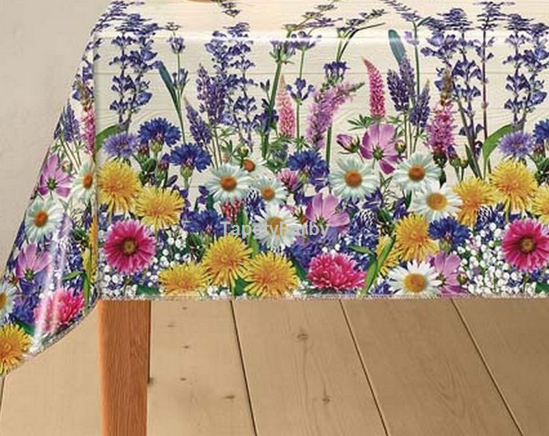 Letnia kolorowa łąka z najpiękniejszych letnich spacerów :) Przepiękne kolorowe kwiatki, stokrotki, kaczeńce i jeszcze inne, ciekawe, czy Państwo poznają, jakie... Motyw kwiatowy ułożony po obydwu brzegach ceraty, tworzy niepowtarzalną kantę. Tło z motywem jasno-beżowej deski. Wzór nieprzeciętny!